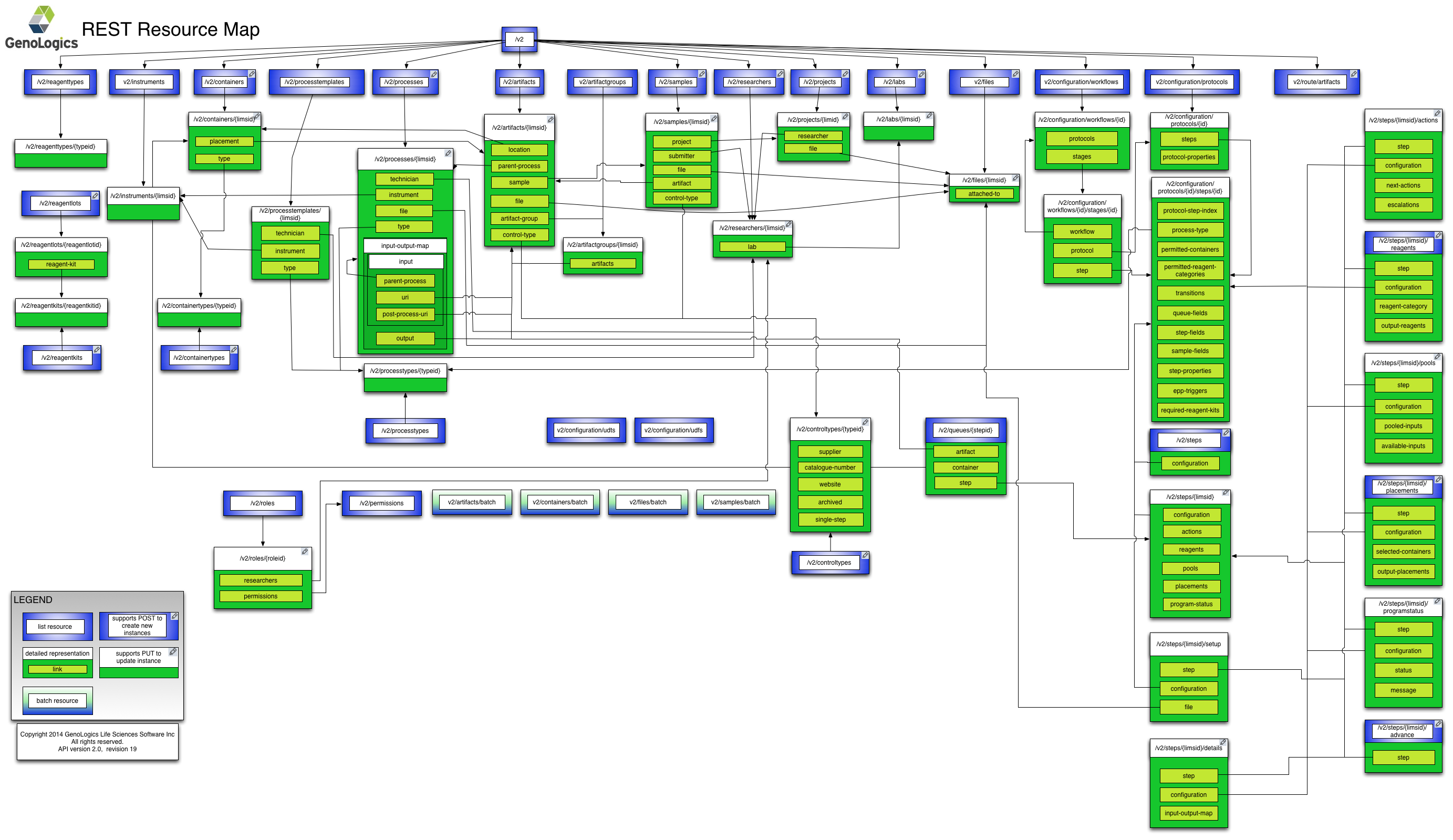 A good place to start is in the REST General Concepts section. To help navigate the resources, the following diagram highlights the methods available and the major resource relationships.