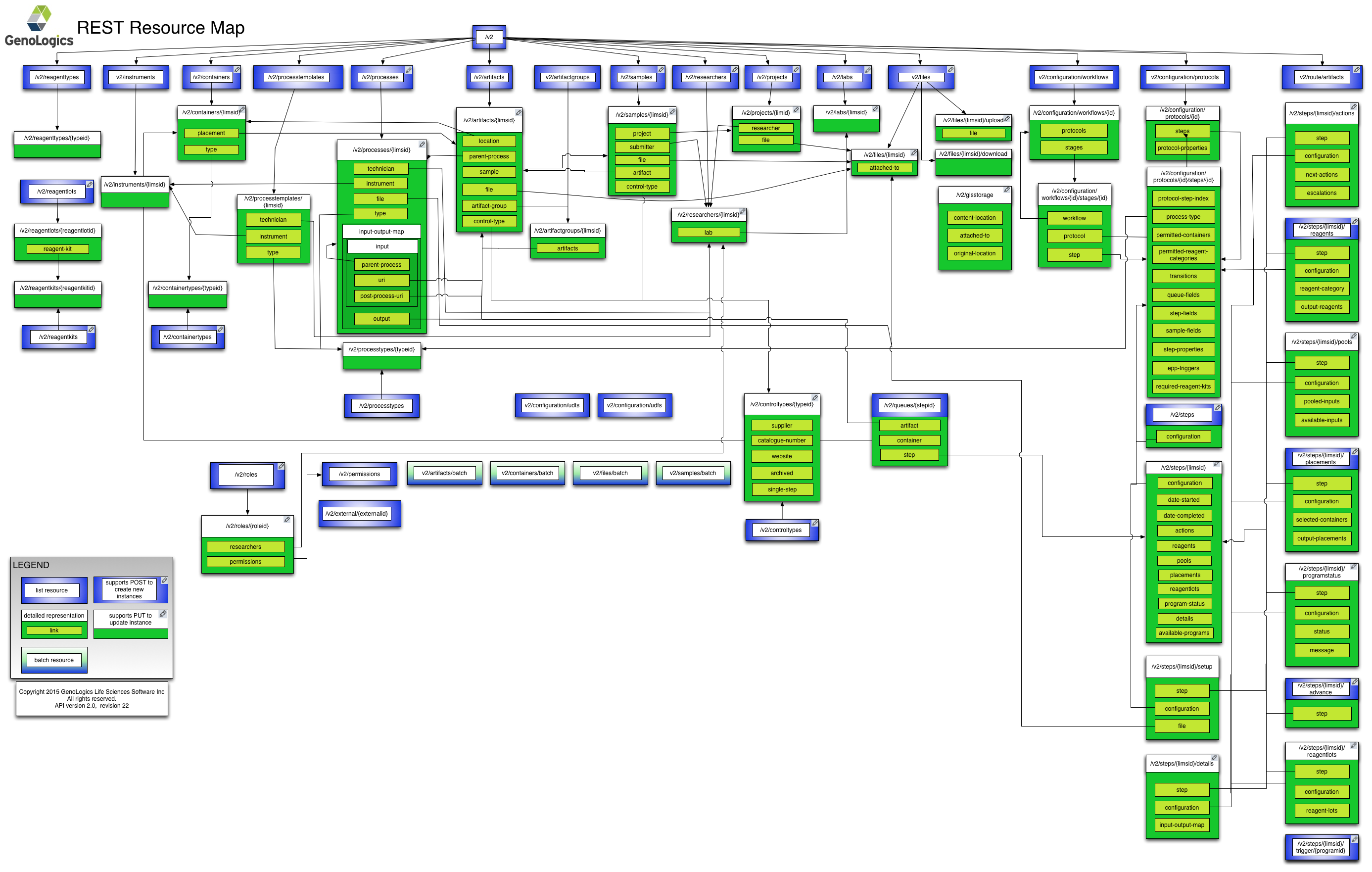 A good place to start is in the REST General Concepts section. To help navigate the resources, the following diagram highlights the methods available and the major resource relationships.