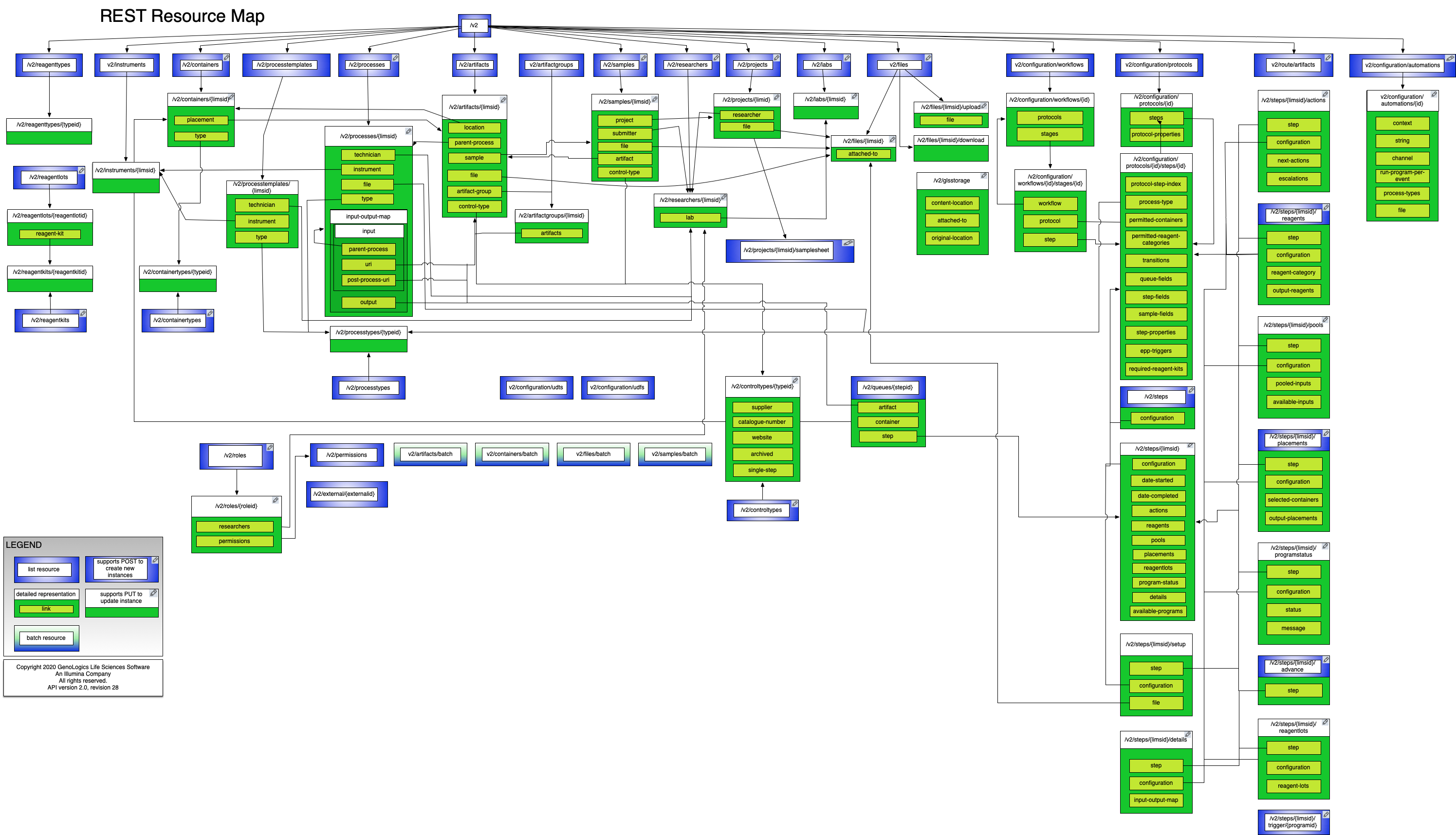 A good place to start is in the REST General Concepts section. To help navigate the resources, the following diagram highlights the methods available and the major resource relationships.